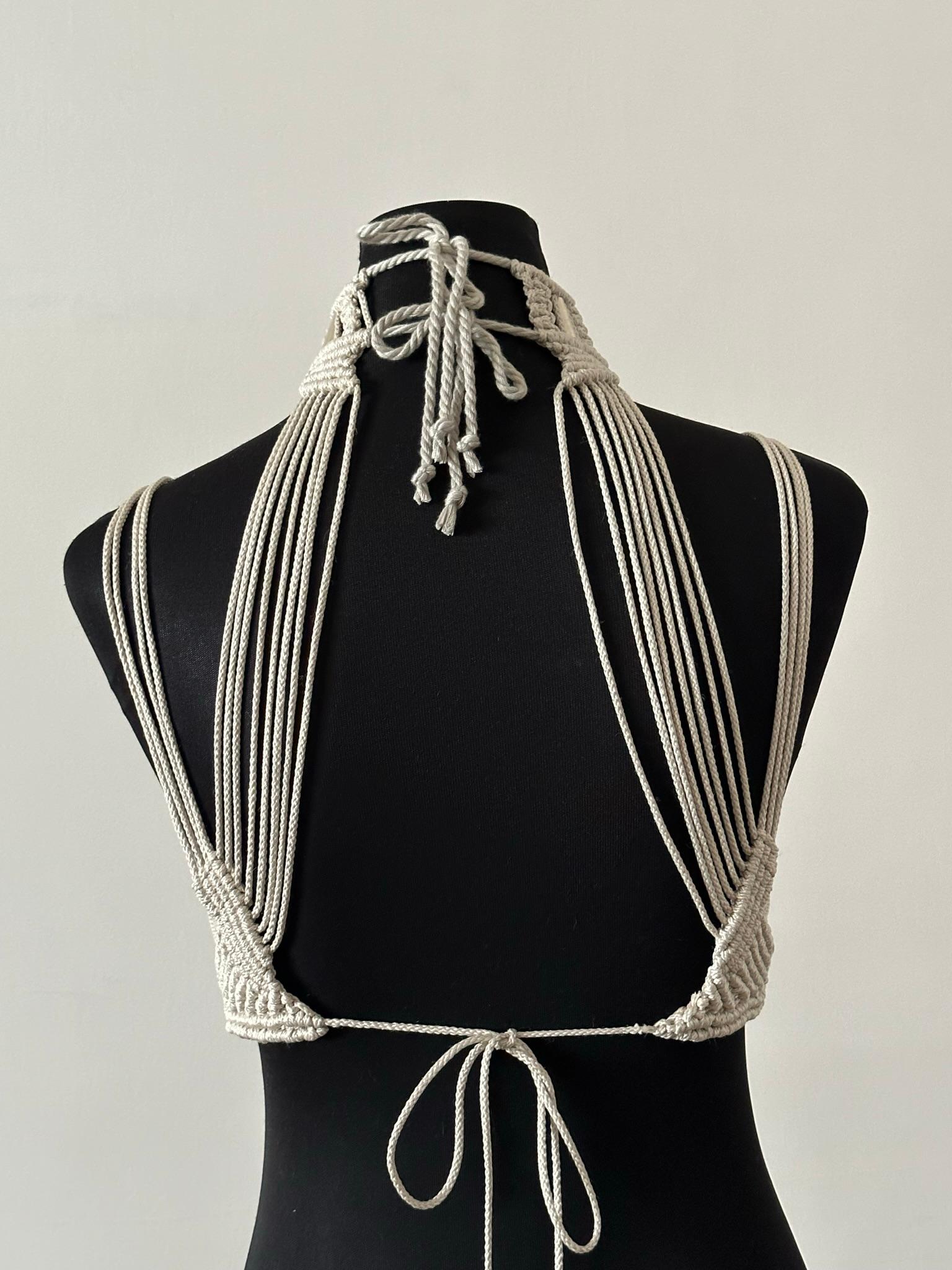Elevate your style game with the 'Lustrous Knots Metallic Bustier.' This handcrafted masterpiece features intricate macrame designs, blending modern elegance with timeless craftsmanship. Ideal for making a bold fashion statement, this bustier is a testament to artistry and sophistication.
