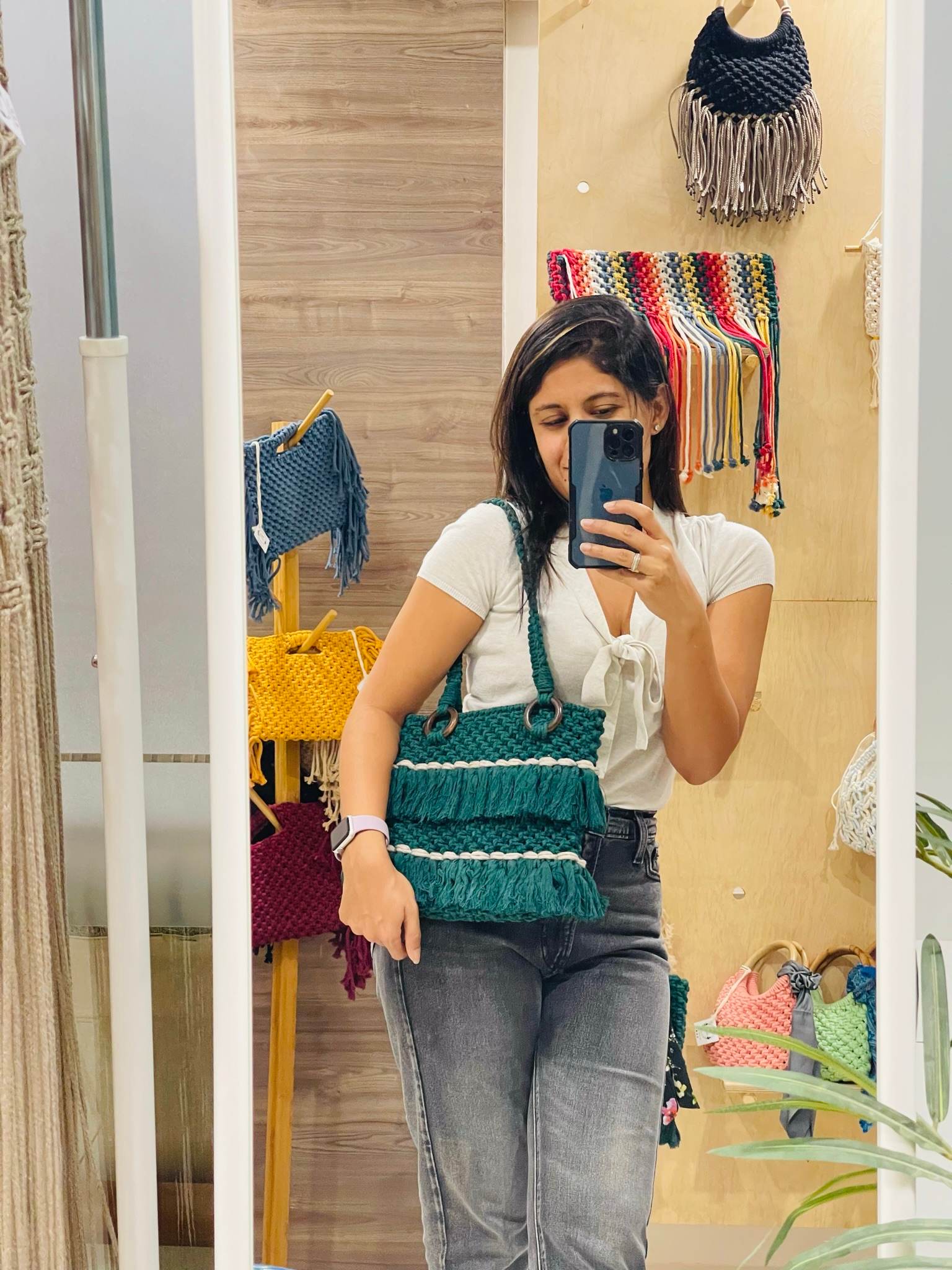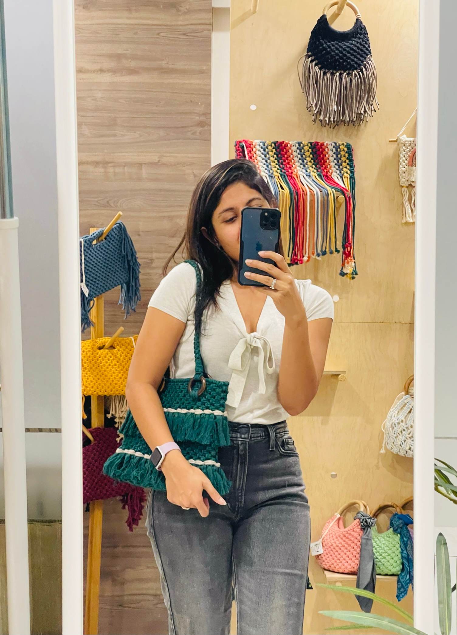 "Enhance your accessory collection with this elegant Handwoven green Fringe Tote Bag a perfect blend of style and practicality!"