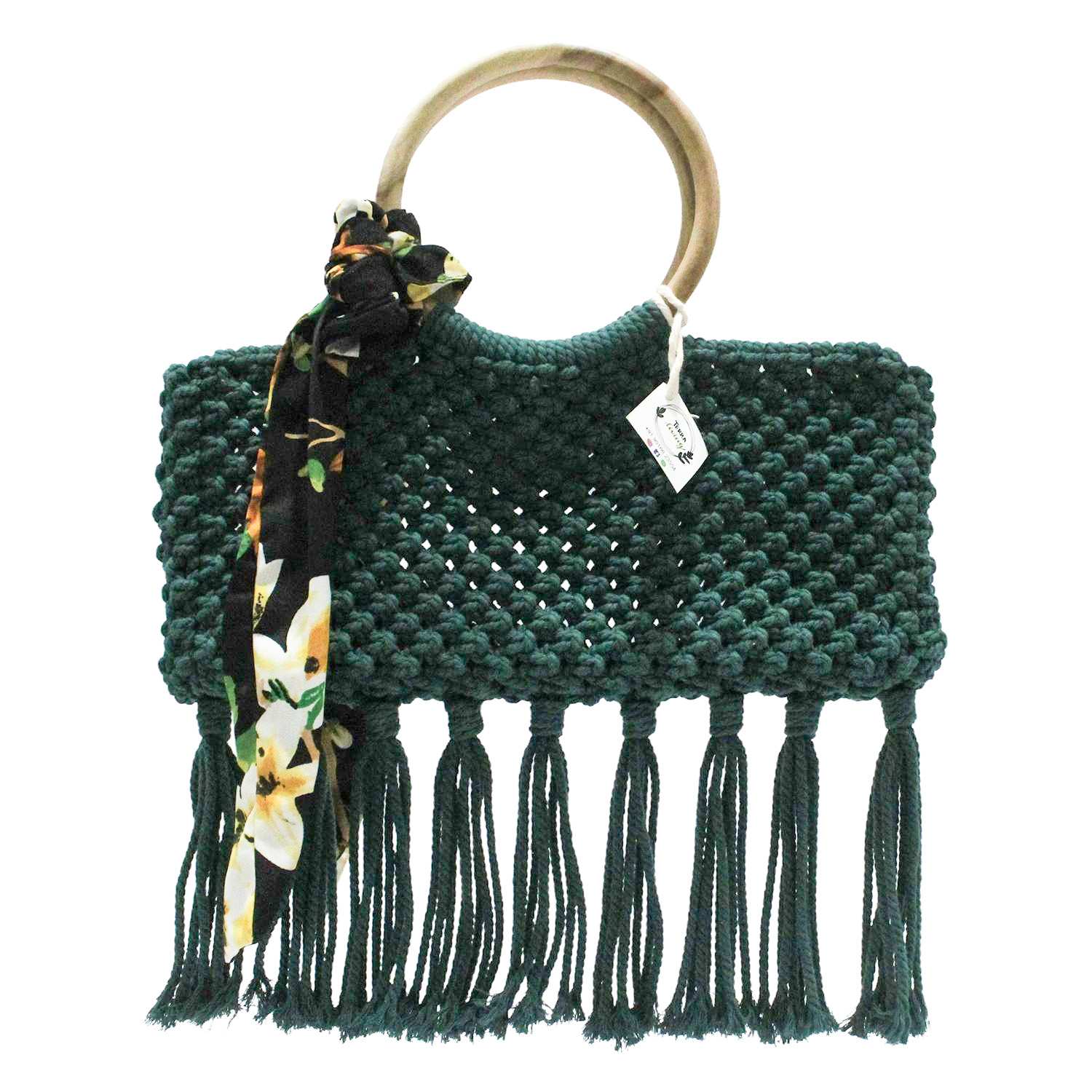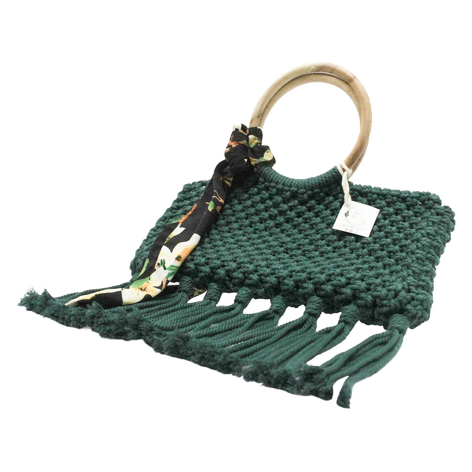 Step into elegance with this Handwoven Macramé Tassel Bag in a rich green hue. Designed with exquisite craftsmanship, it features a natural wooden handle and a chic floral scarf accent. The intricate macramé pattern and playful tassels make it an ideal statement piece for any occasion, from casual outings to sophisticated events.