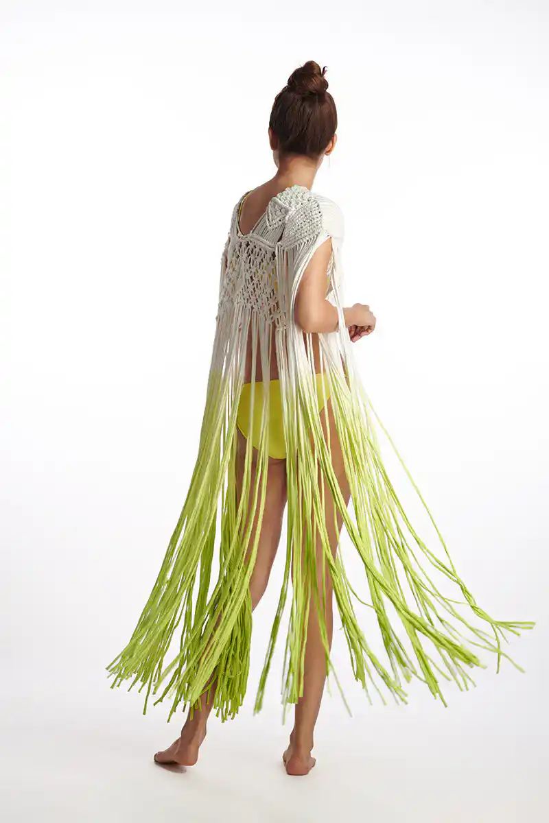 - Design: Intricate macrame weaving with cascading fringe in a stunning white-to-mint gradient.