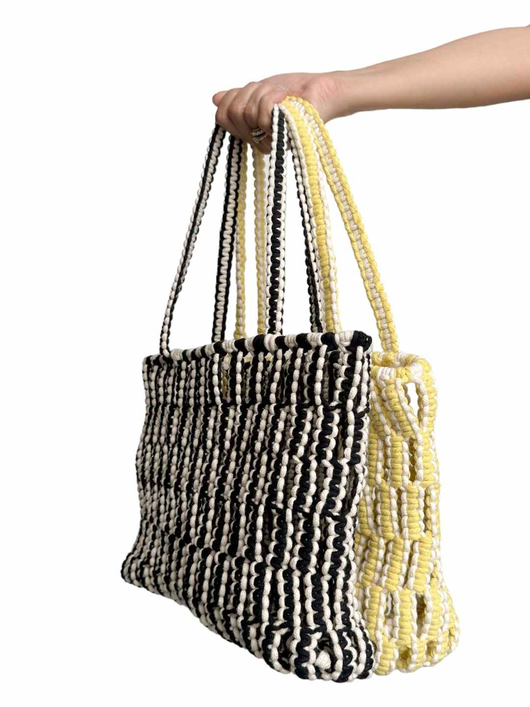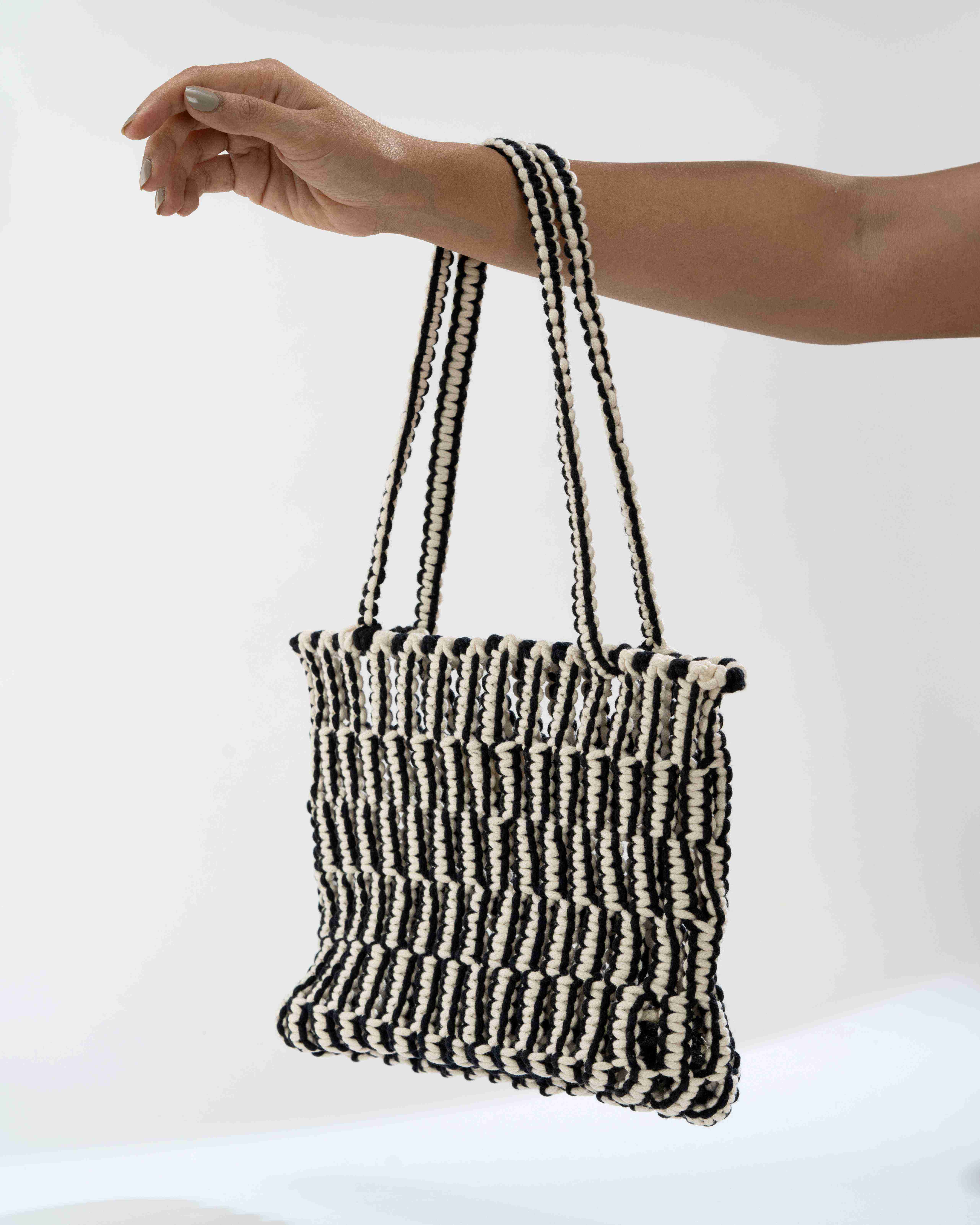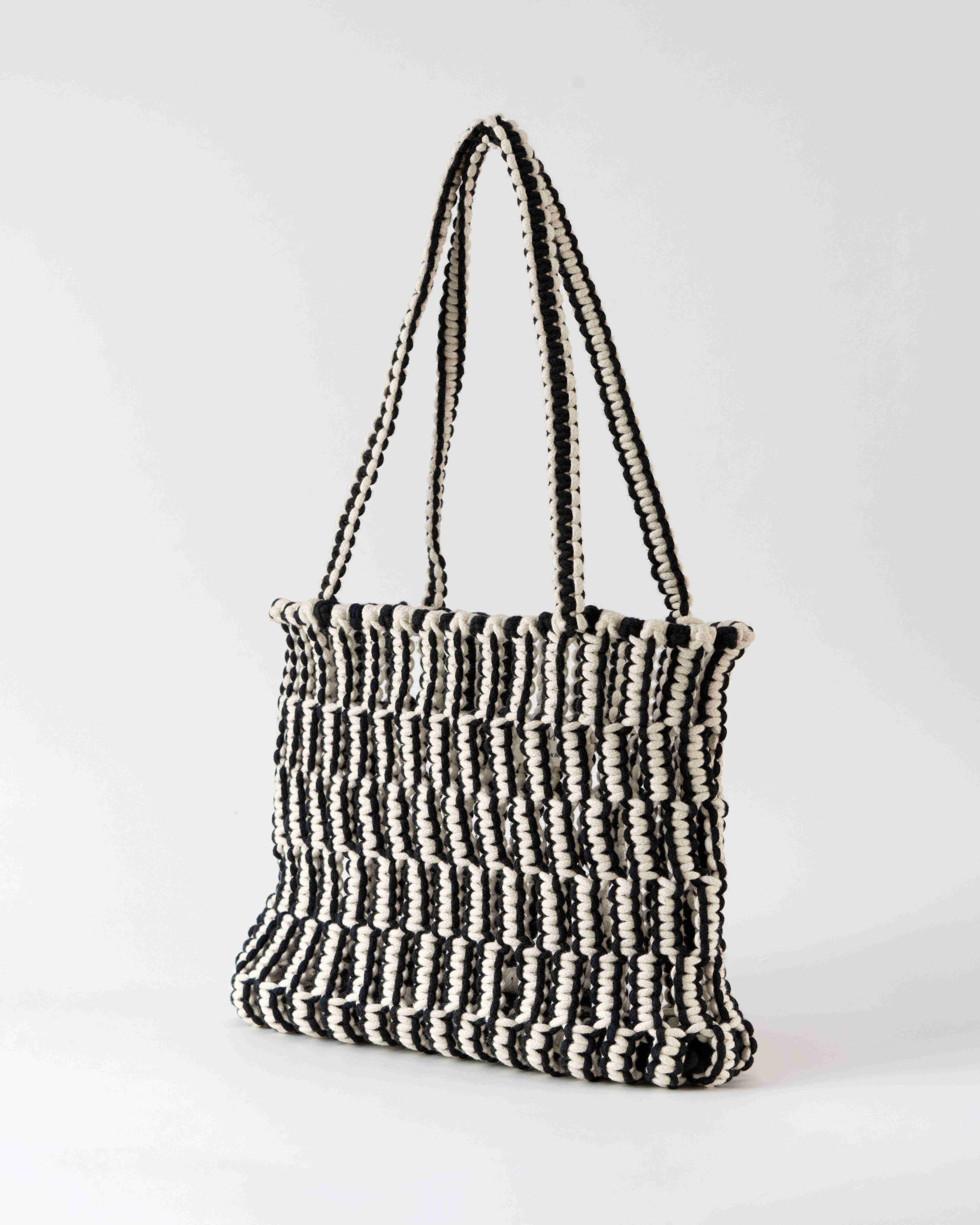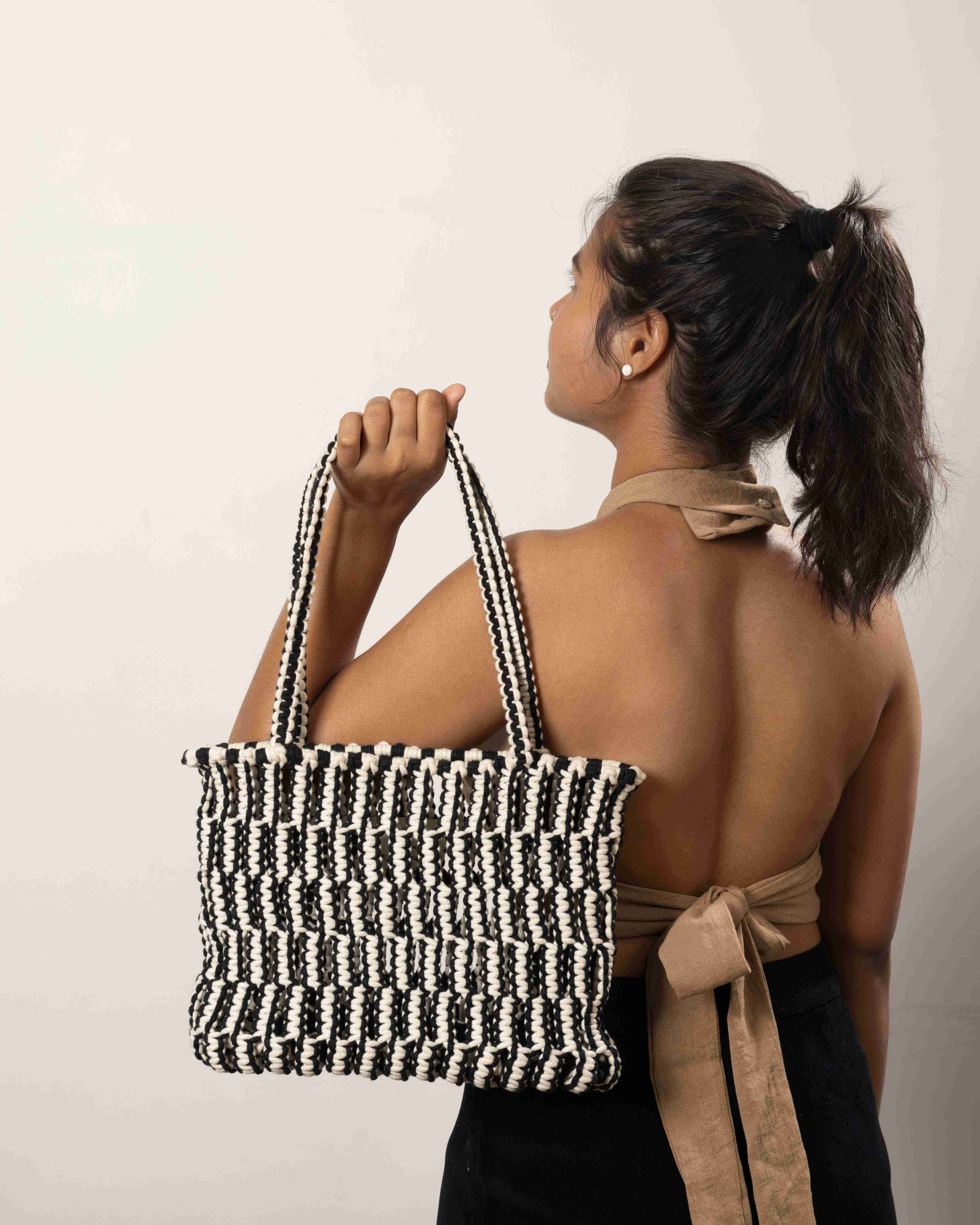 Elevate your accessory game with this black-and-white handcrafted tote bag. With its bold, monochrome pattern and spacious design, this bag is perfect for making a statement while carrying all your essentials. Designed for versatility and style, it’s a must-have for both casual and chic occasions.