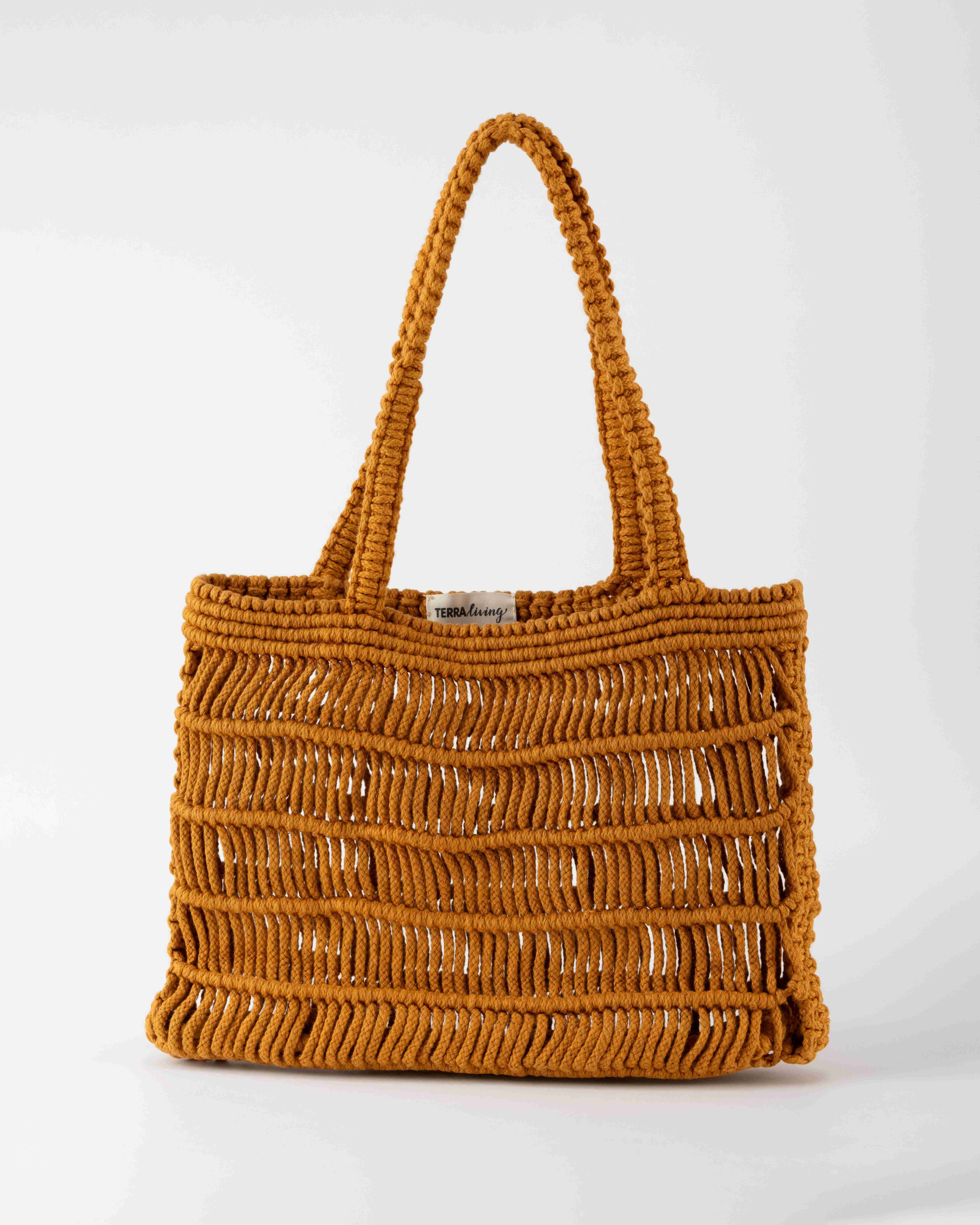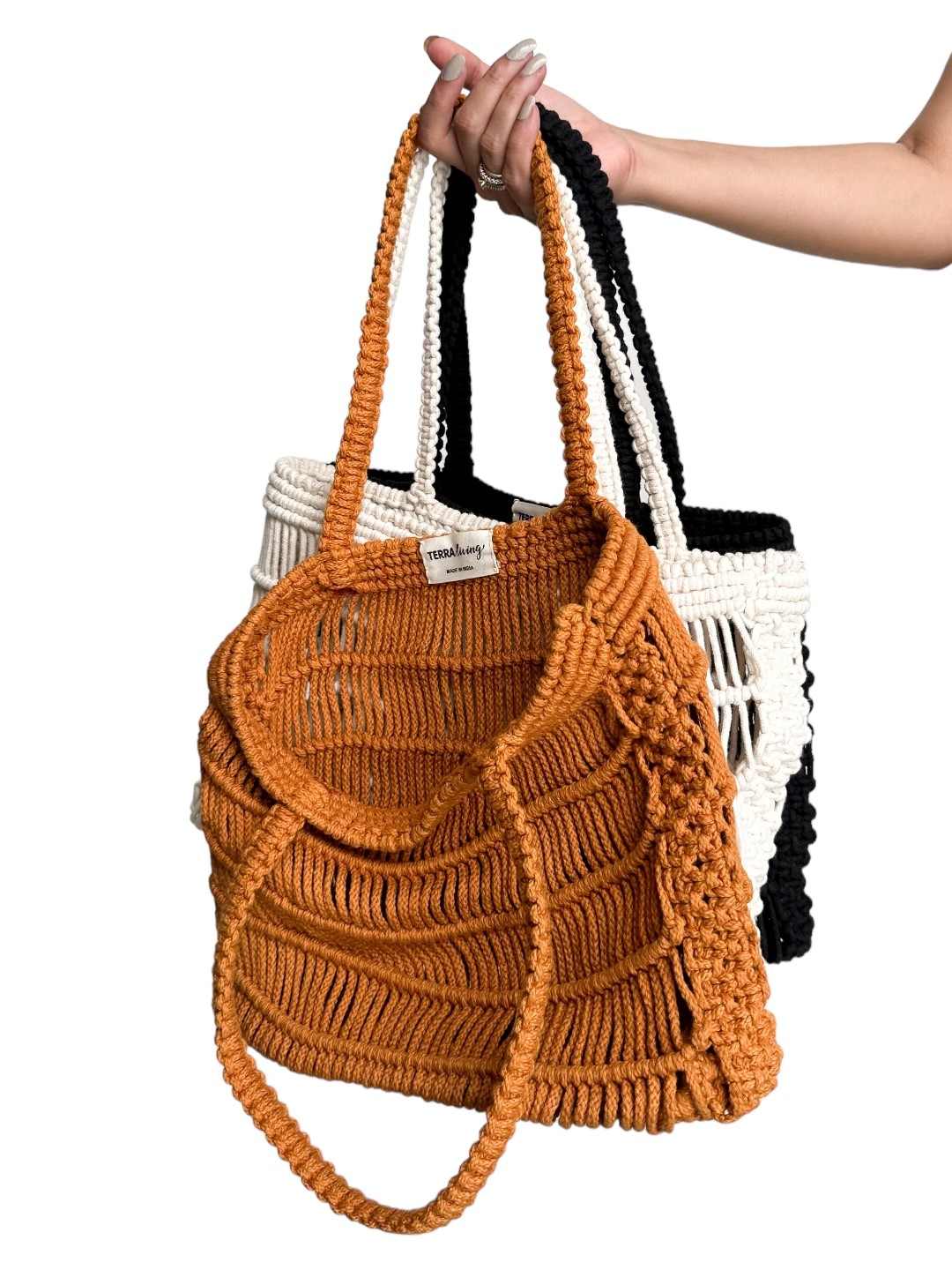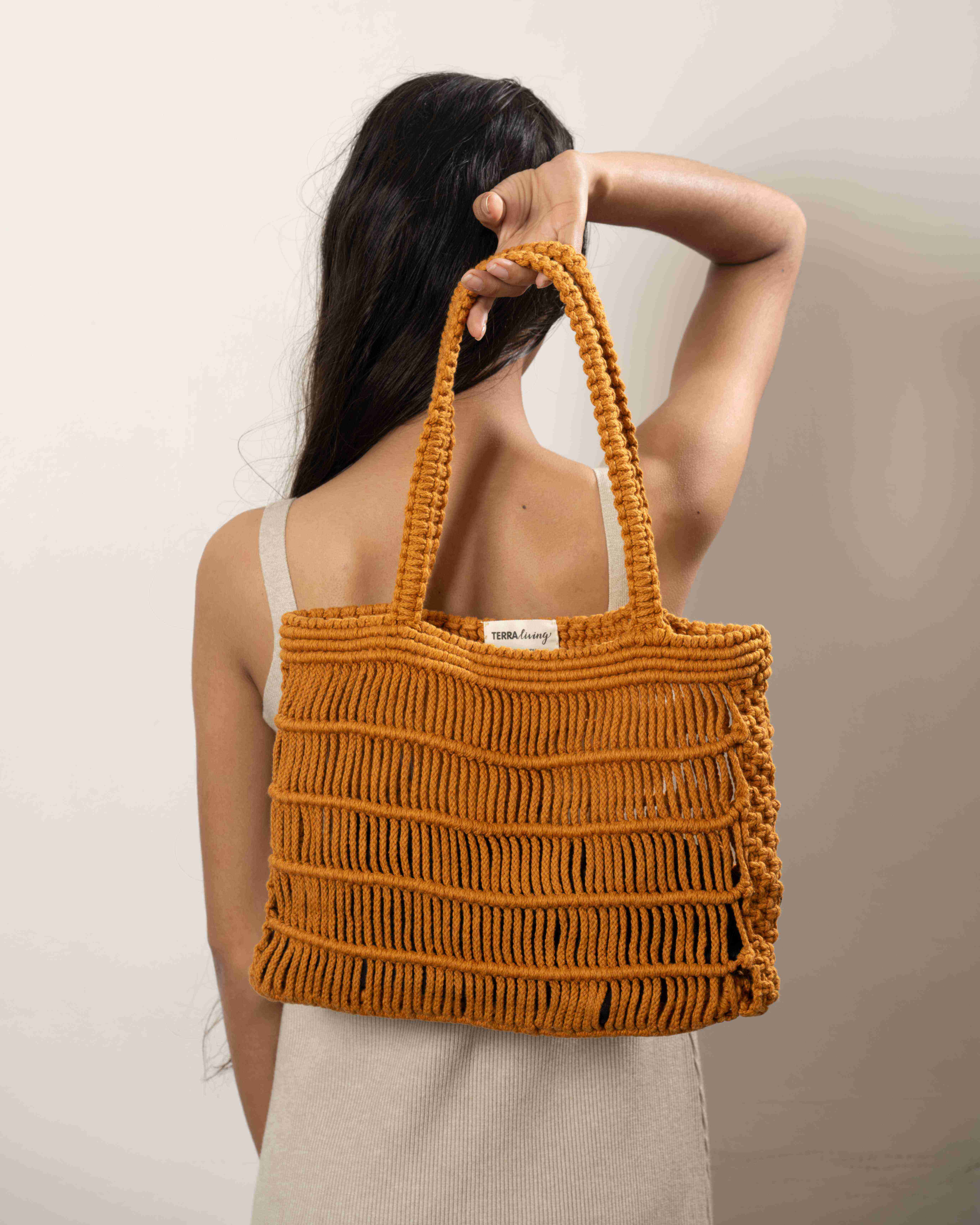 "Make this macramé tote bag your go-to accessory for a stylish and eco-friendly lifestyle."